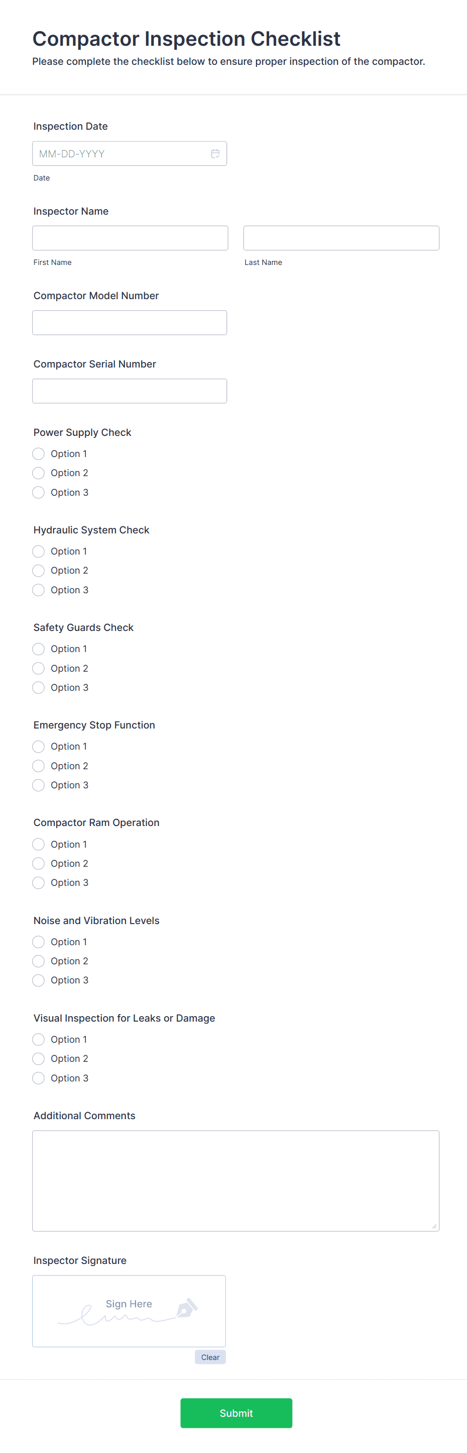 An inspection form is a structured document used to assess, record, and report the condition, compliance, or quality of assets, environments, or processes during an inspection.