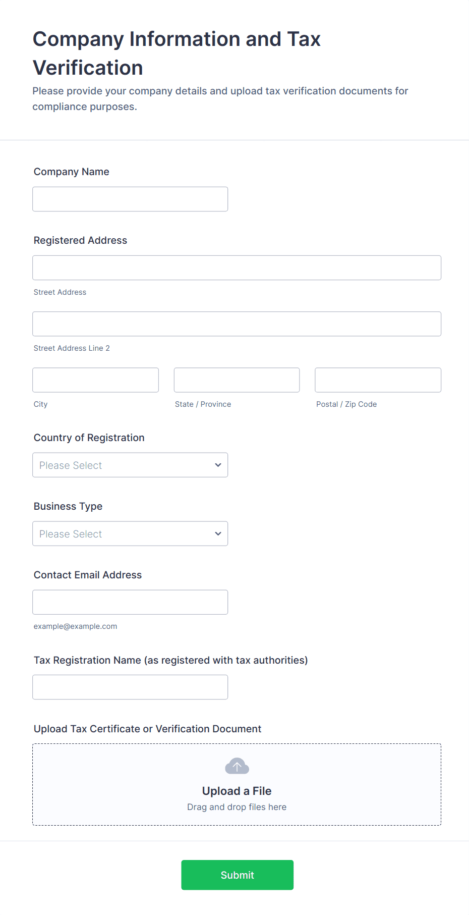 - For verification, include fields for uploading documents (e.g., ID, proof of address, certificates).