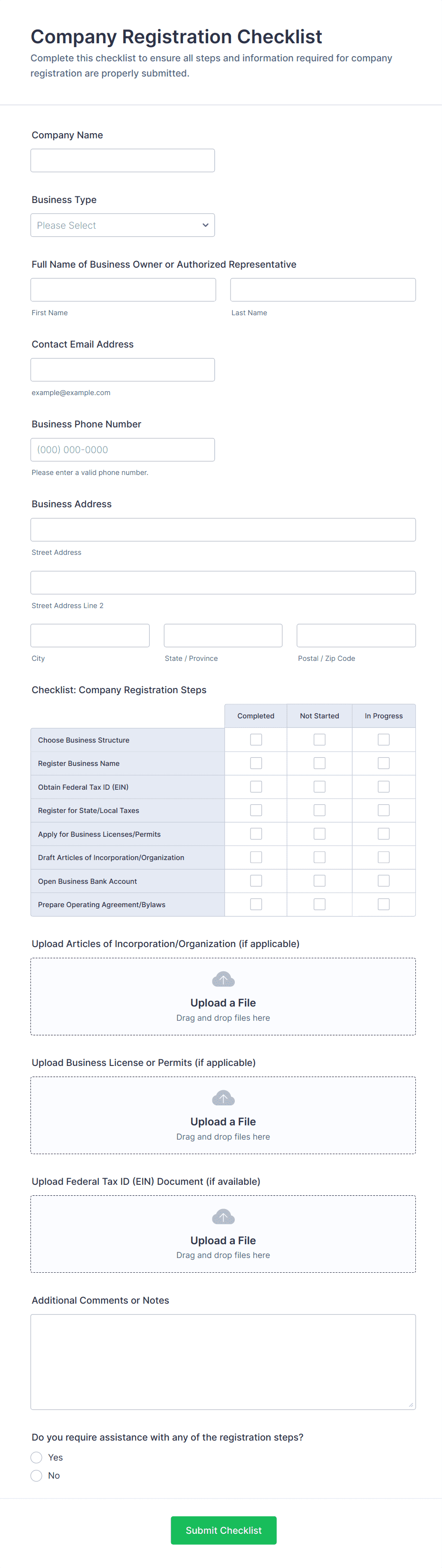 - Upload fields for supporting documents (e.g., articles of incorporation, licenses)