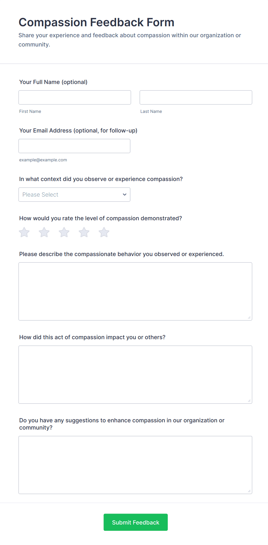 Create an anonymous feedback form in seconds with this ready-made template. Easy to customize and share. Works on any device. No coding knowledge required.