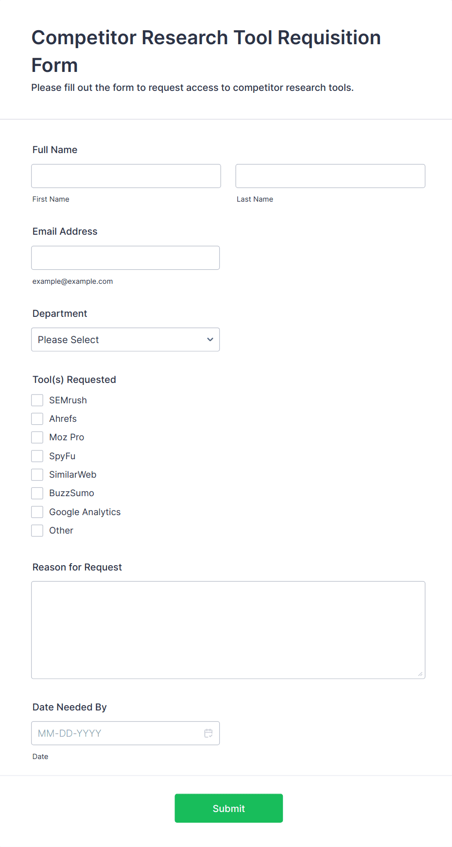 A marketing form template is a pre-designed online form used to collect information for marketing purposes, such as lead generation, event registration, customer feedback, or newsletter sign-ups.
