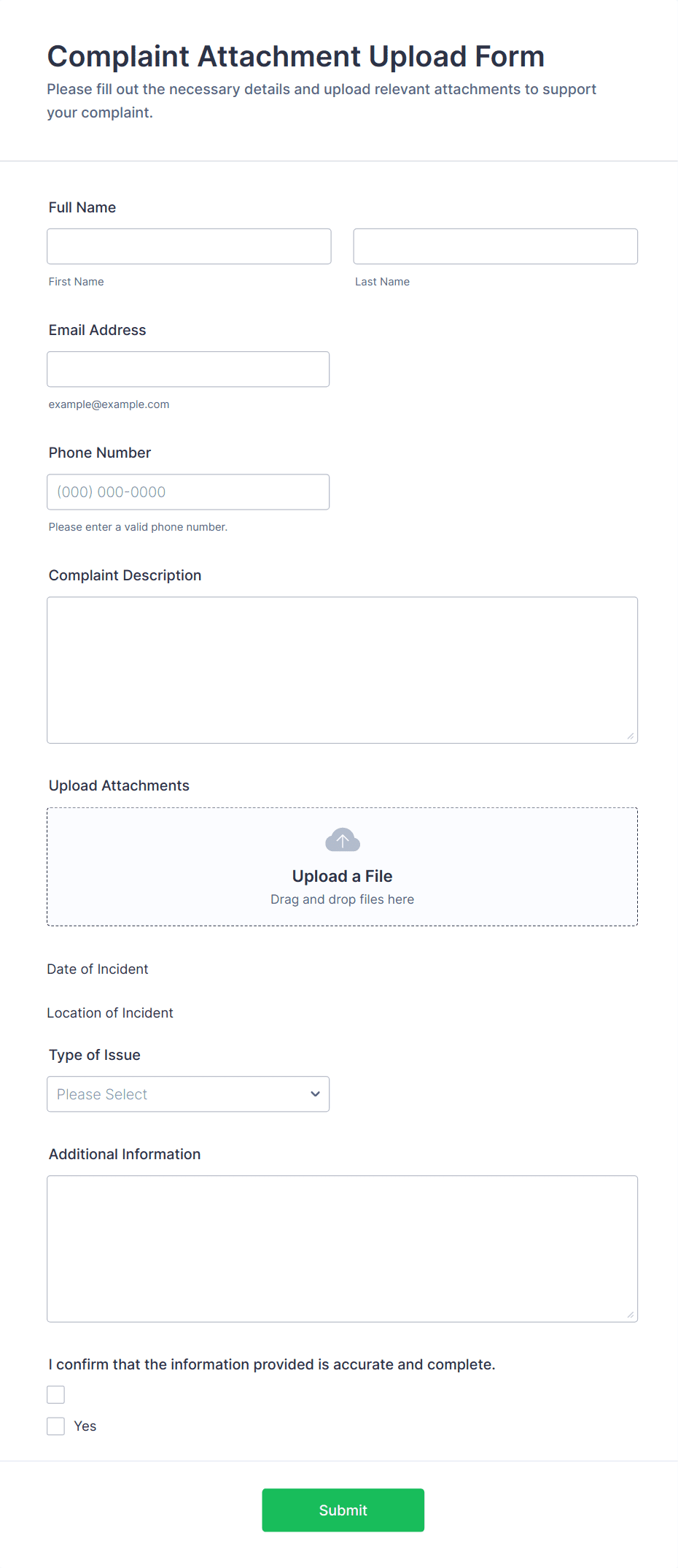 • Use conditional logic to show or hide fields based on user responses (e.g., display additional questions if the complaint is about a specific service).