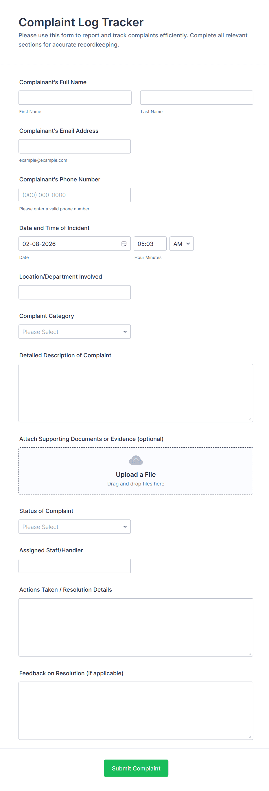• Conditional Logic: Certain fields may appear only if specific options are selected (e.g., type of complaint).