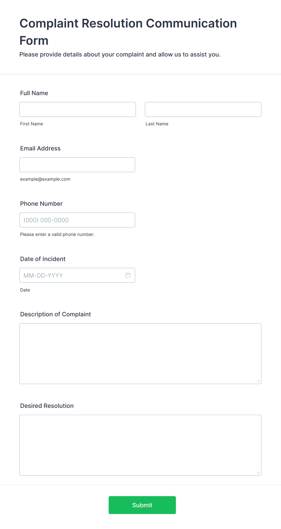 • Use conditional logic to show or hide fields based on user responses (e.g., display additional questions if the complaint is about a specific service).