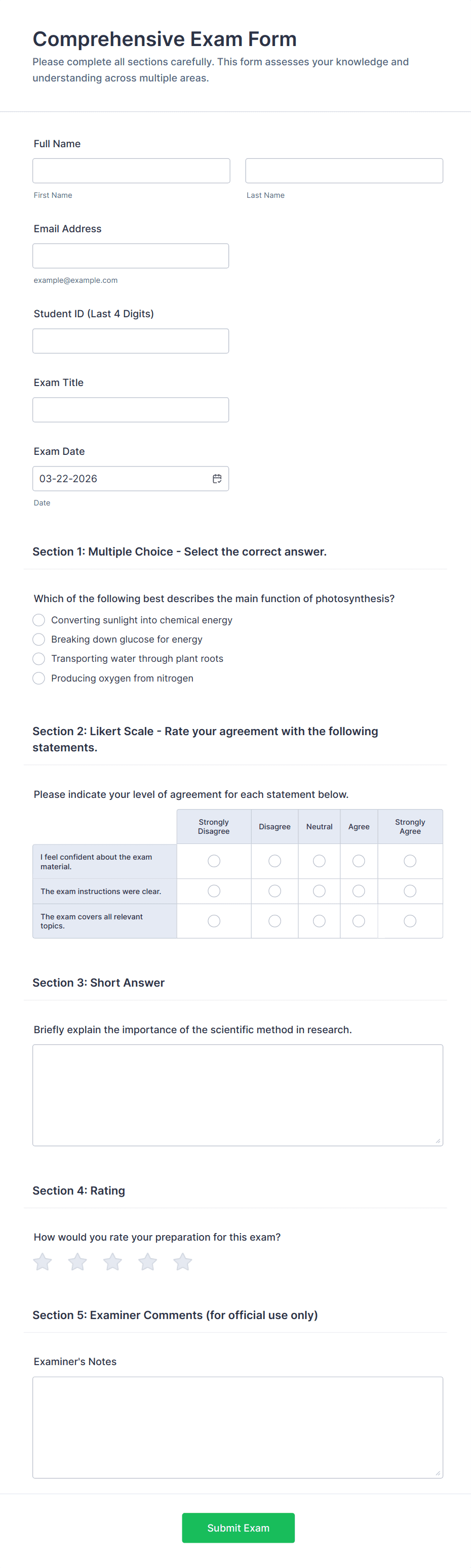 An exam form is a digital tool used to create, distribute, and collect responses for assessments such as quizzes, tests, and exams in educational or professional settings.