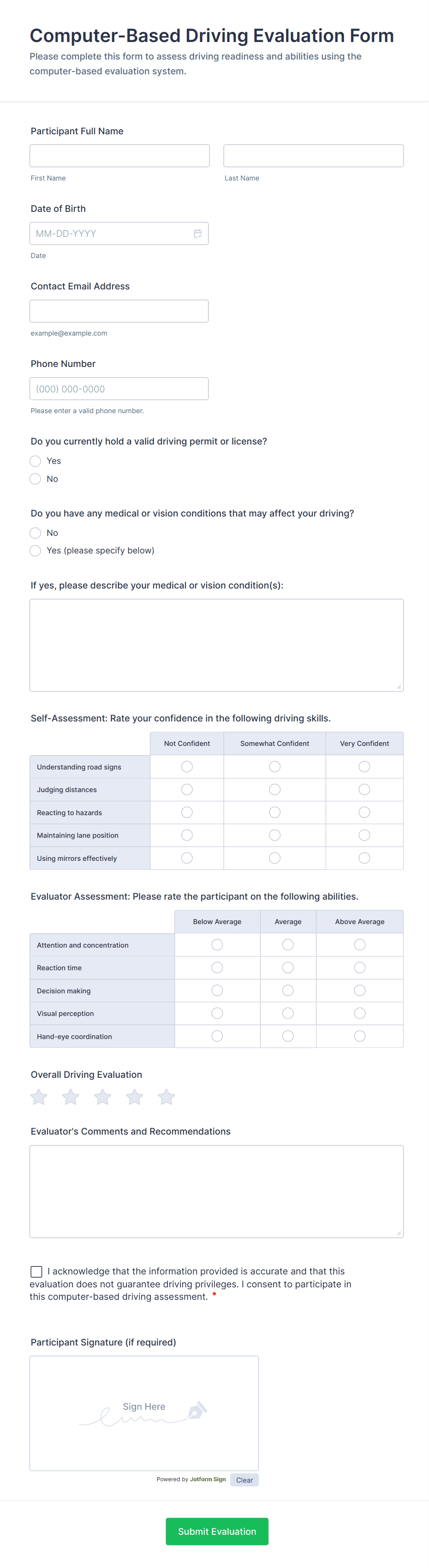 Need a form that keeps up with your transportation business? Try Jotform’s free Driver Forms to organize driver applications, vehicle inspections, and feedback forms in one central place. Pick a template that works for you and start customizing your form by choosing your own logo, fonts and colors, and integrating with 100+ third-party platforms. Our drag-and-drop builder makes it easy to design a form that fits your business. Send out your completed form to your drivers and clients, or embed it in your website for quick access. Take your forms on the road with powerful Driver Forms from Jotform.