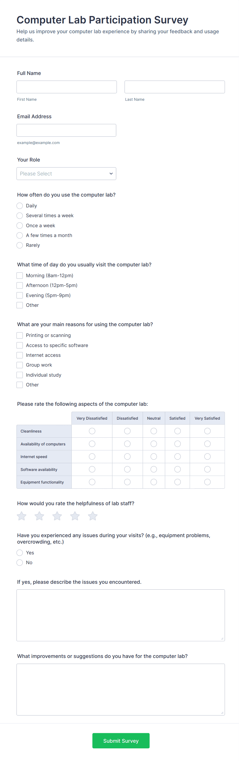 Typical fields include demographic information, technology usage patterns, satisfaction ratings, open-ended feedback, and specific questions about software, hardware, or digital skills.