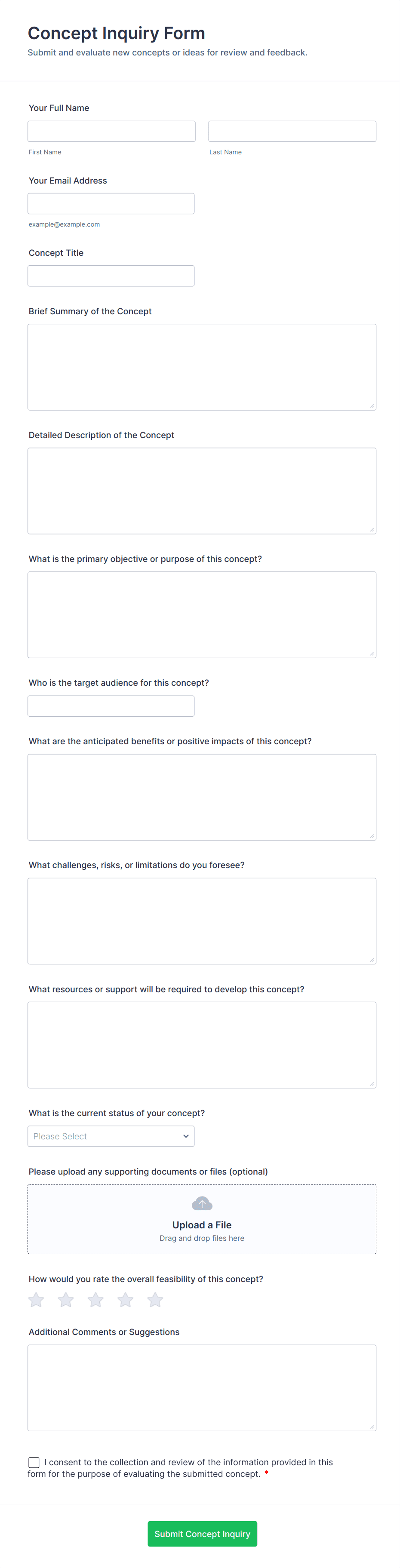 Inquiry Form Templates are pre-designed digital forms used to collect questions, requests, or information from users, customers, or stakeholders. These templates are commonly utilized by businesses, educational institutions, service providers, and non-profit organizations to streamline the process of receiving and managing inquiries. Whether you need to gather product questions, service requests, partnership proposals, or general feedback, inquiry forms provide a structured and efficient way to capture essential details. Typical use cases include customer support inquiries, event information requests, sales leads, job application questions, and more.