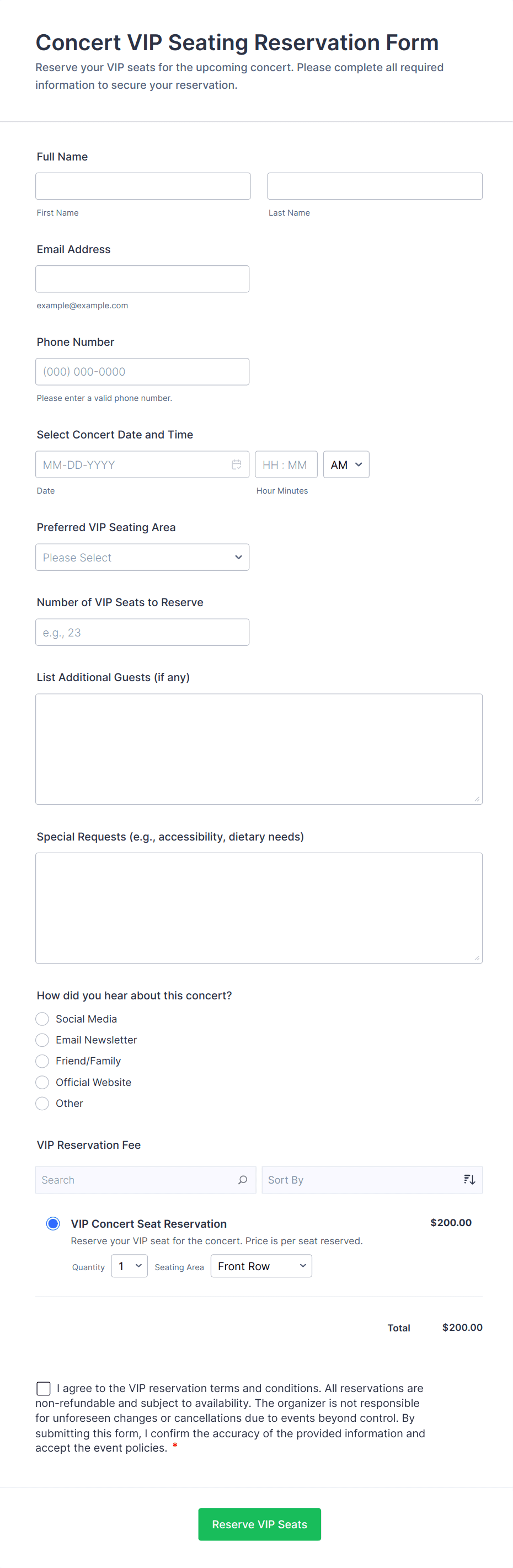 • Restaurants: Forms may include party size, preferred seating, dietary restrictions, and special requests.
