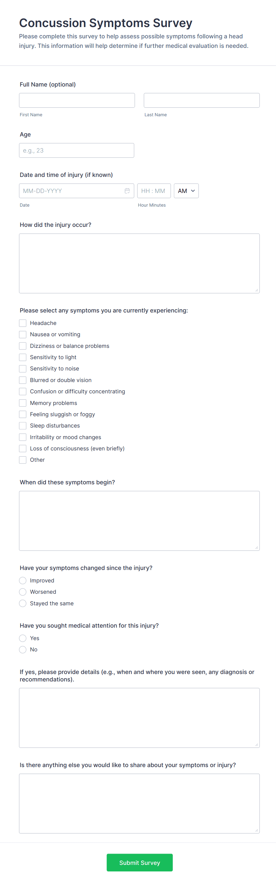 Medical surveys and questionnaires are essential tools used by healthcare professionals, researchers, clinics, and organizations to collect valuable information about patients’ health, medical histories, symptoms, treatment outcomes, and overall well-being. These forms can be used for a variety of purposes, such as patient intake, health risk assessments, satisfaction surveys, mental health screenings, post-visit feedback, and clinical research studies. By gathering structured data directly from patients or study participants, medical surveys and questionnaires help streamline workflows, improve patient care, and support evidence-based decision-making in healthcare settings.