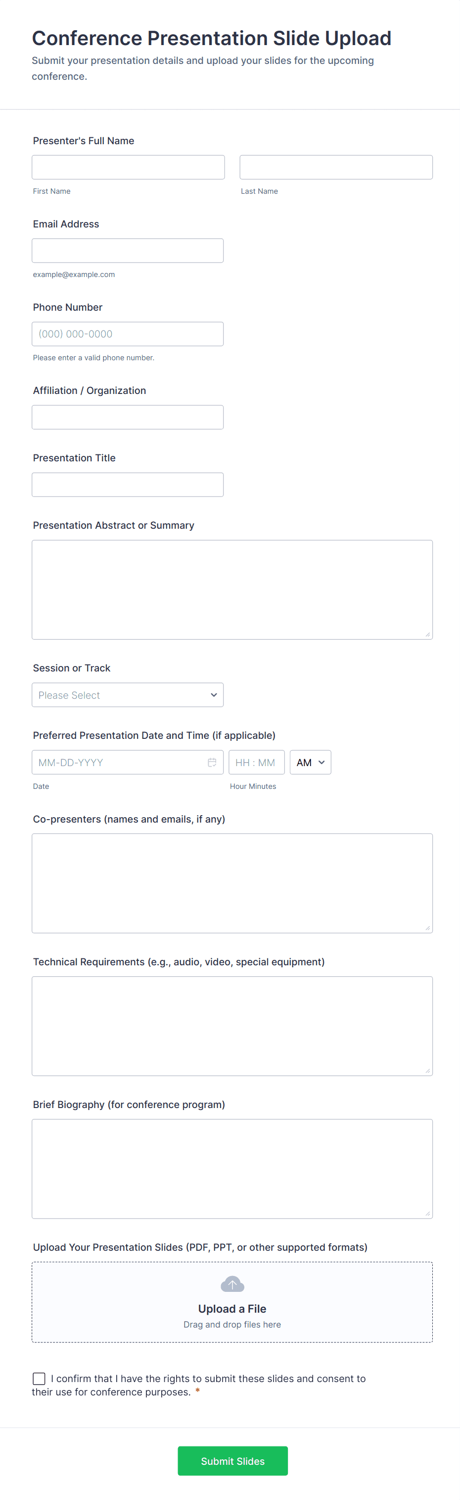 File Upload Forms are specialized online forms designed to collect files, documents, images, or other digital assets directly from users. These forms are commonly used in scenarios where individuals or organizations need to gather supporting materials, such as job applications with resumes, event registrations with ID proofs, homework submissions, design requests, or client onboarding documents. The versatility of File Upload Forms makes them essential for businesses, educational institutions, creative agencies, HR departments, and service providers who require a secure and efficient way to receive files from clients, students, or collaborators.