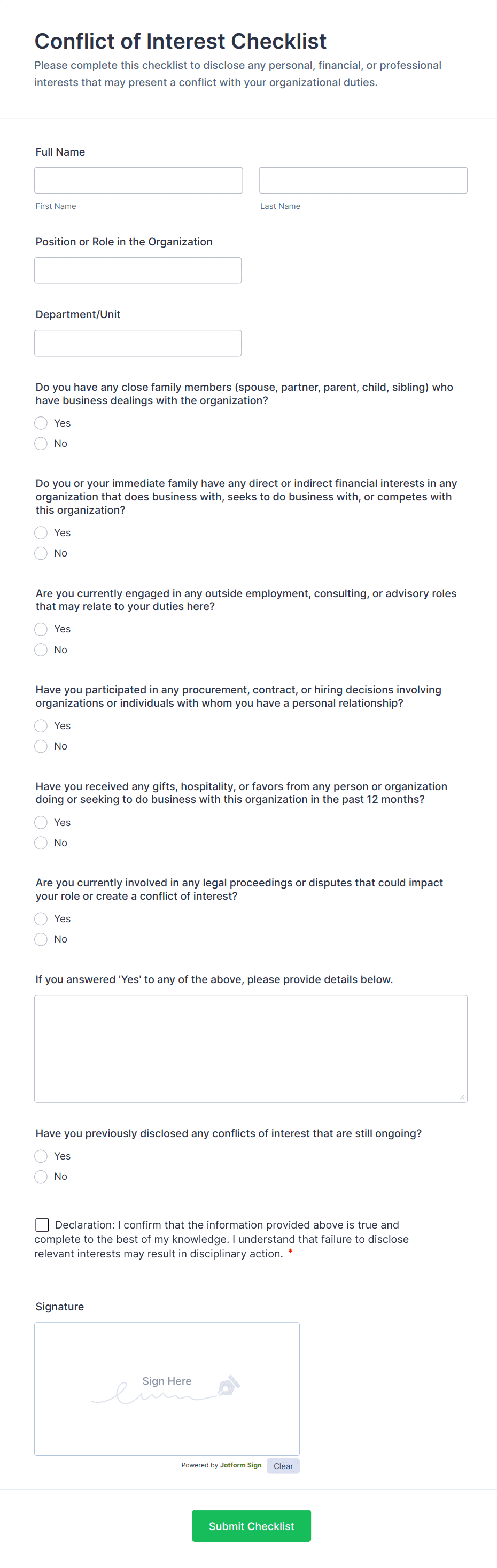 By following these steps, you can create a checklist form that streamlines your processes, ensures consistency, and provides valuable documentation for compliance or reporting. Jotform’s flexibility allows you to adapt your checklist forms as your needs evolve, making it a powerful tool for ongoing task management.