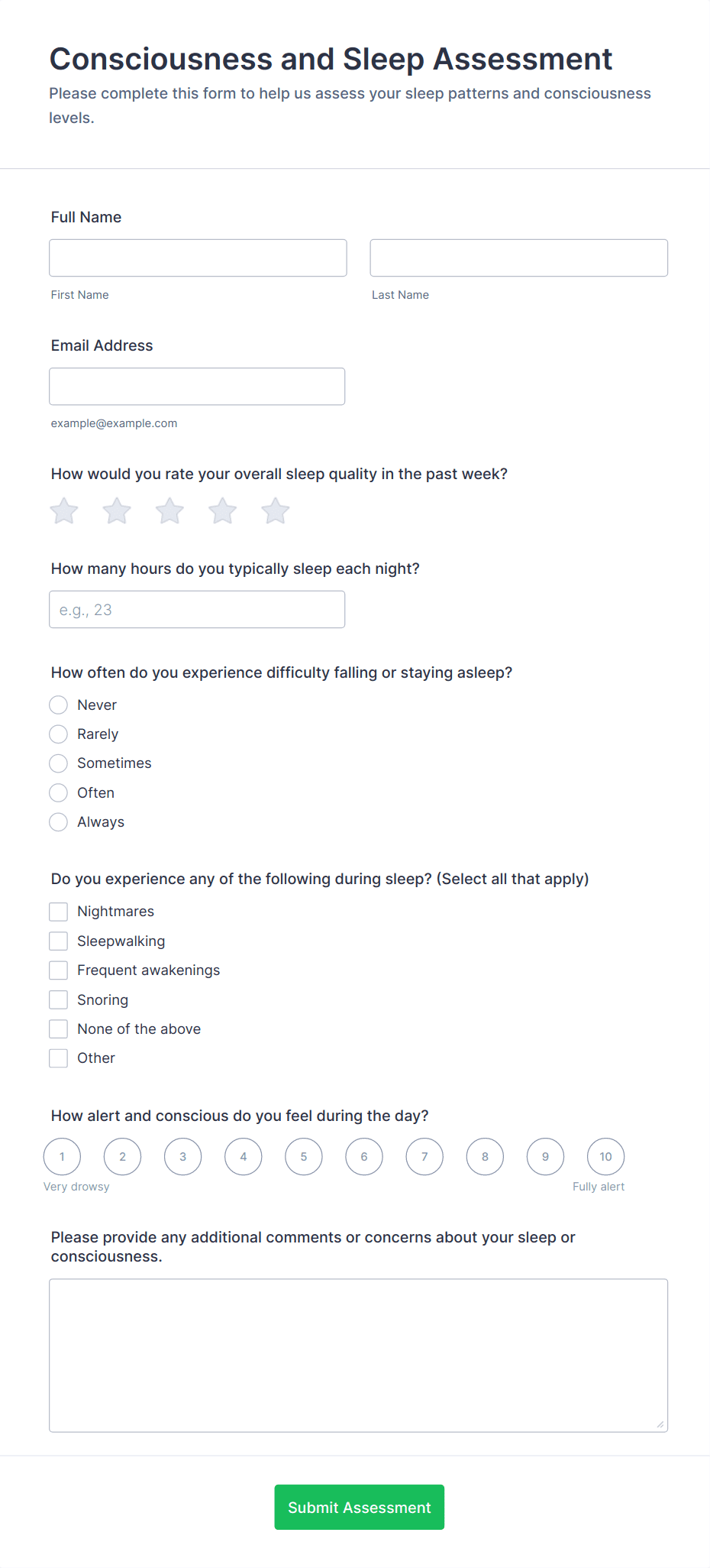 Add fields for symptoms, medical history, medications, allergies, lifestyle factors, and functional status depending on the assessment type. Use rating scales for severity and impact.
