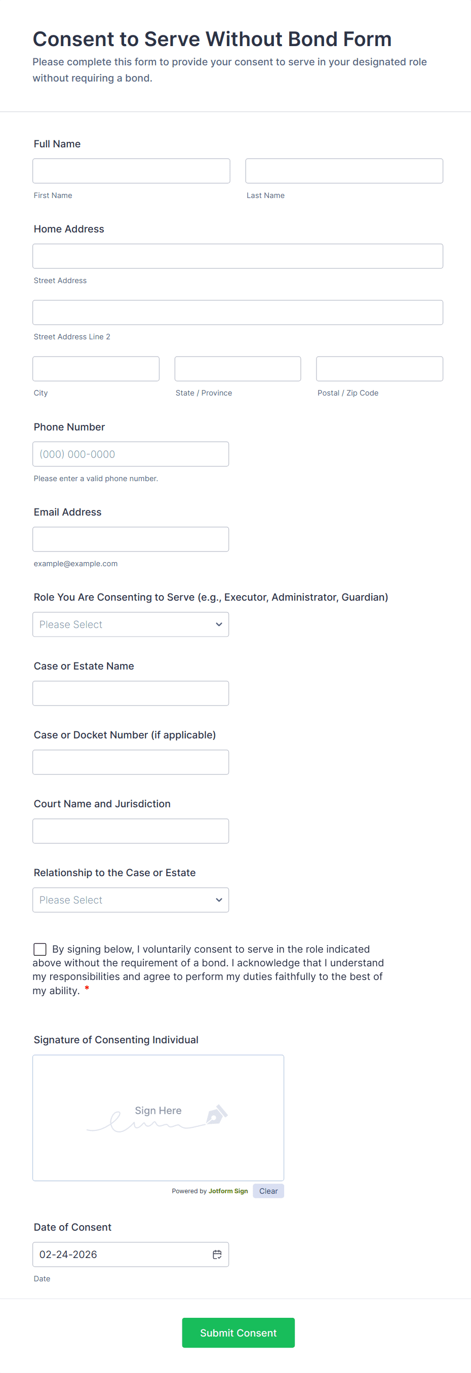 The form templates here are for informational purposes only. Jotform is not providing legal, financial, or other advice, or implying that the forms are legally valid in all or any jurisdictions. Before using any such form, consult an attorney and/or other applicable professionals to make sure that the form meets your needs, legally and otherwise.