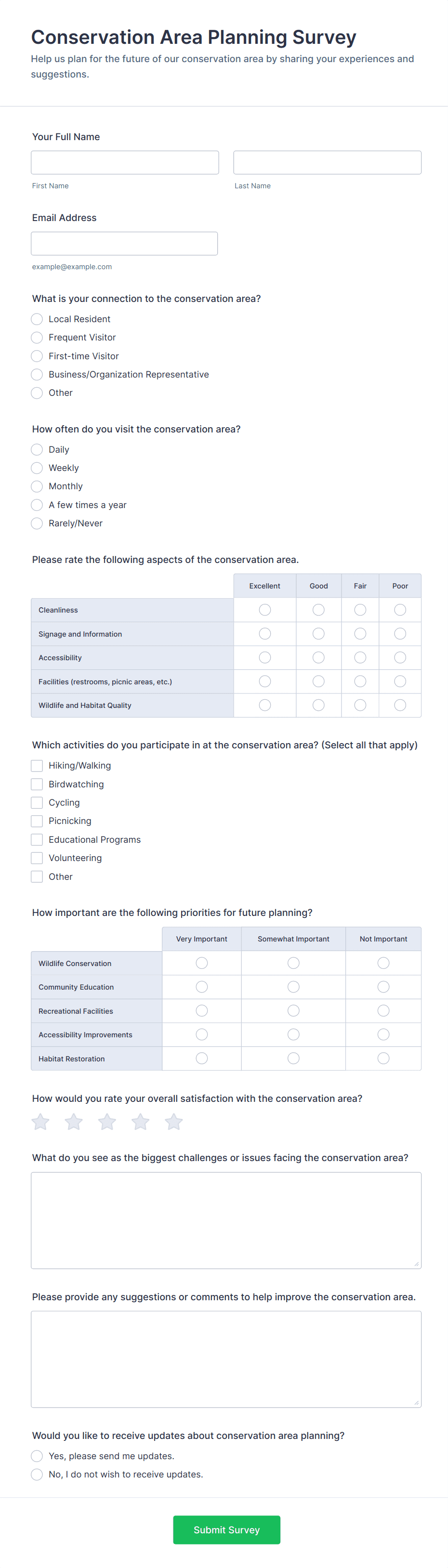 Survey templates are pre-designed forms that help individuals and organizations collect feedback, opinions, or data from a target audience. These templates are widely used for a variety of purposes, such as customer satisfaction surveys, employee engagement assessments, market research, event feedback, and academic studies. By providing a structured set of questions, survey templates streamline the process of gathering valuable insights, making it easier to analyze trends, measure satisfaction, and make informed decisions. Whether you’re a business owner, HR professional, educator, or researcher, survey templates offer a quick and effective way to reach your audience and collect actionable information.