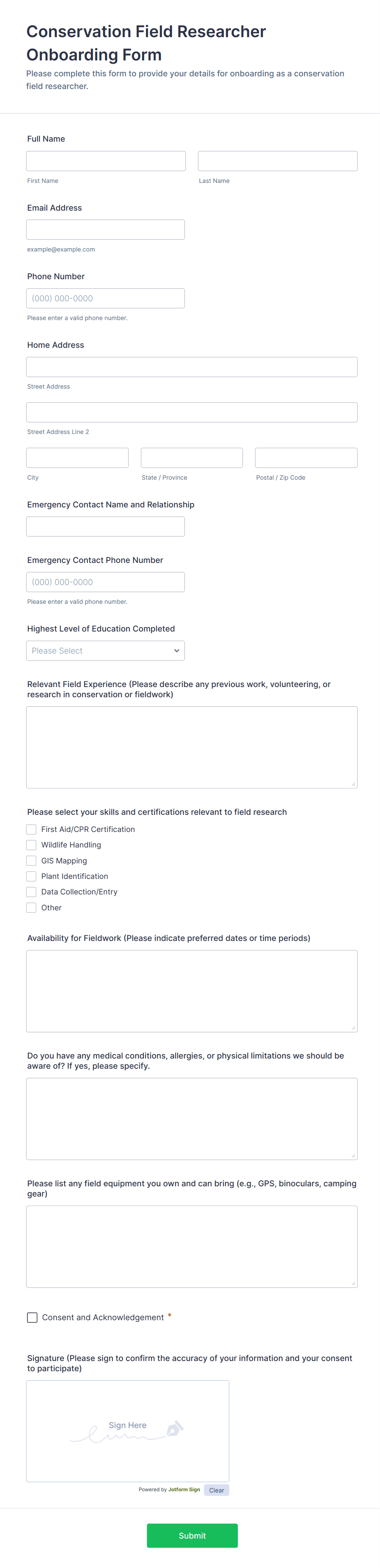 Onboarding Form Templates are specialized digital forms designed to streamline the process of integrating new employees, clients, students, or members into an organization or program. These templates help collect essential information, set expectations, and ensure a smooth transition for newcomers. Common use cases include employee onboarding, client intake, volunteer registration, student enrollment, and vendor onboarding. By standardizing the onboarding process, these forms help organizations gather necessary data, provide important resources, and establish clear communication from the very beginning.