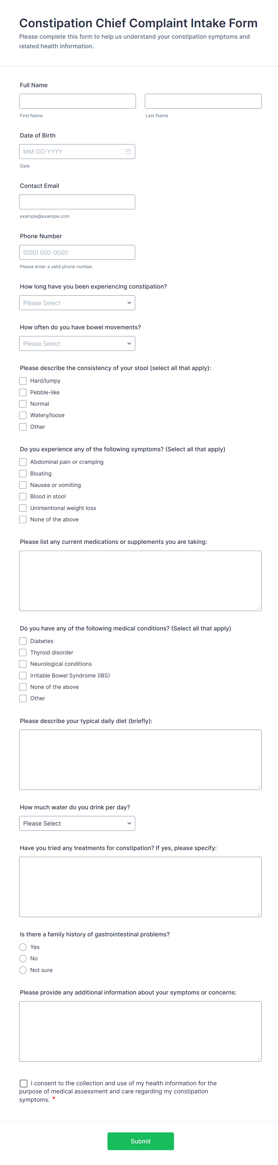 Intake forms are essential tools used to gather preliminary information from clients, patients, customers, or participants before providing a service or beginning a process. These forms streamline the onboarding process by collecting relevant details such as contact information, background data, preferences, and specific needs. Intake forms are widely used across various industries, including healthcare (patient intake), legal (client intake), education (student intake), human resources (employee onboarding), and service-based businesses (client consultations). By standardizing the information-gathering process, intake forms help organizations ensure consistency, improve efficiency, and deliver personalized experiences.