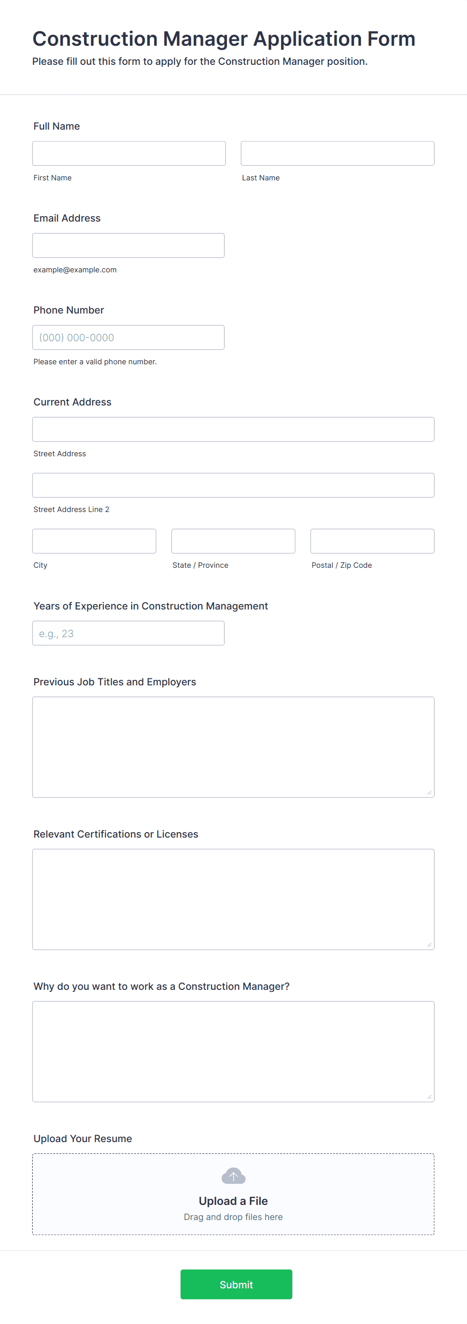 A Construction Job Application Form is a form template designed to streamline the hiring process for construction companies and HR departments