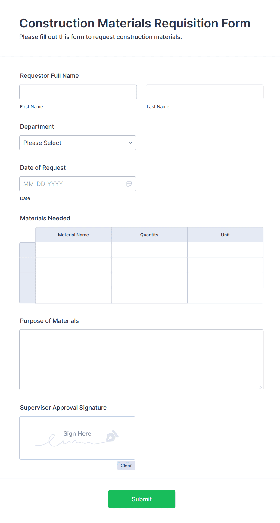 Boost your business with Construction Forms that streamline your workflow and eliminate the need for messy paperwork. Whether you’re a contractor, developer, landscaper, or materials supplier, you can use Jotform to handle everything from work order requests and estimates, to safety inspections and jobsite checklists. Choose from our library of free, ready-made Construction Form templates to create reports, invoices, waivers, and contracts you can share with a link or embed in your company website for instant access from any device.