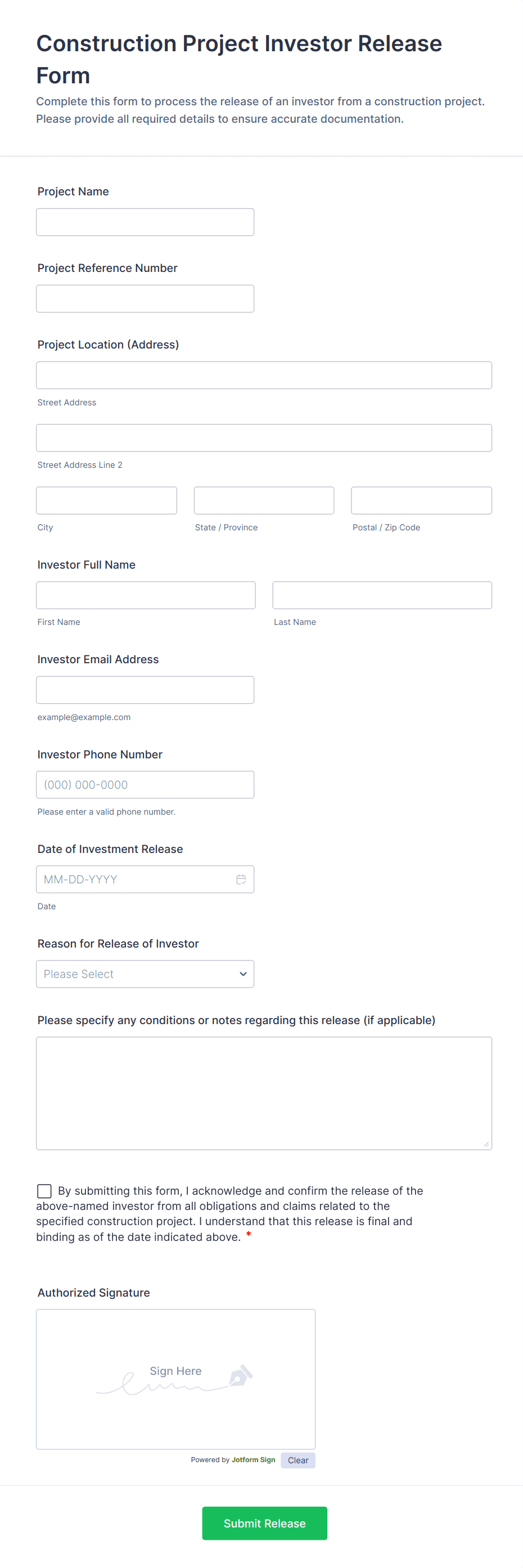 The form templates here are for informational purposes only. Jotform is not providing legal, financial, or other advice, or implying that the forms are legally valid in all or any jurisdictions. Before using any such form, consult an attorney and/or other applicable professionals to make sure that the form meets your needs, legally and otherwise.