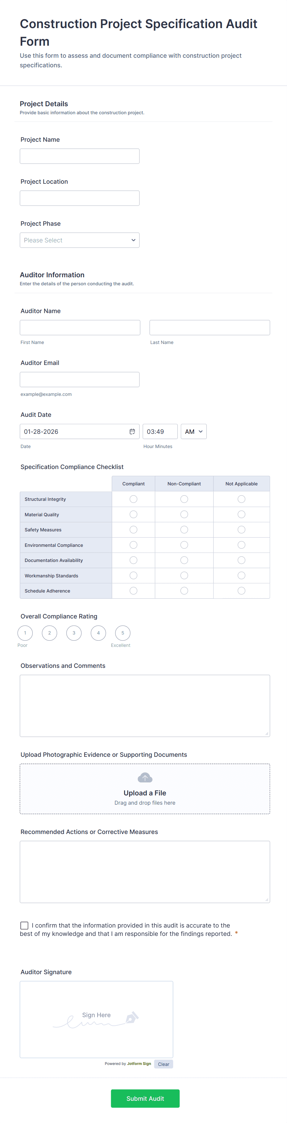 Creating an effective audit form with Jotform is straightforward and highly customizable, allowing you to address a variety of audit scenarios such as safety inspections, compliance checks, or quality control reviews. Here’s a step-by-step guide to building an audit form that fits your organization’s needs: