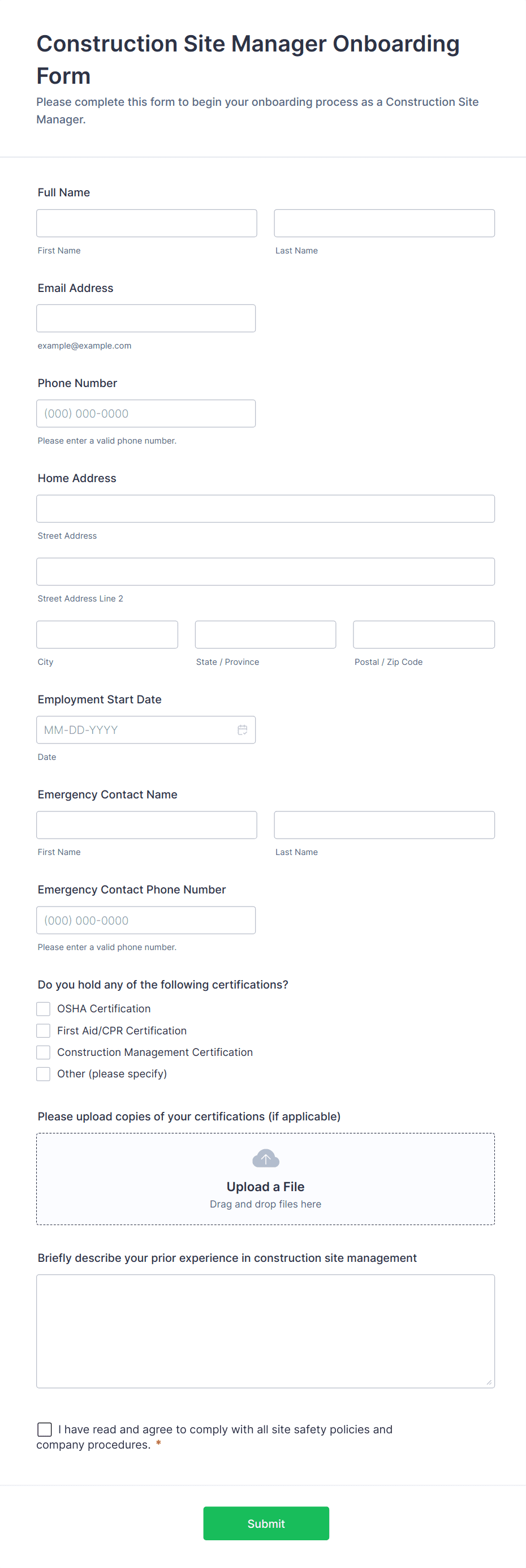 Onboarding Form Templates are specialized digital forms designed to streamline the process of integrating new employees, clients, students, or members into an organization or program. These templates help collect essential information, set expectations, and ensure a smooth transition for newcomers. Common use cases include employee onboarding, client intake, volunteer registration, student enrollment, and vendor onboarding. By standardizing the onboarding process, these forms help organizations gather necessary data, provide important resources, and establish clear communication from the very beginning.
