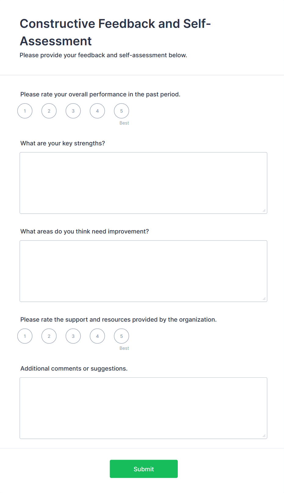 A Feedback Form is a form template designed to gather valuable insights, opinions, and suggestions from individuals or stakeholders regarding a particular product, service, event, experience, or process.