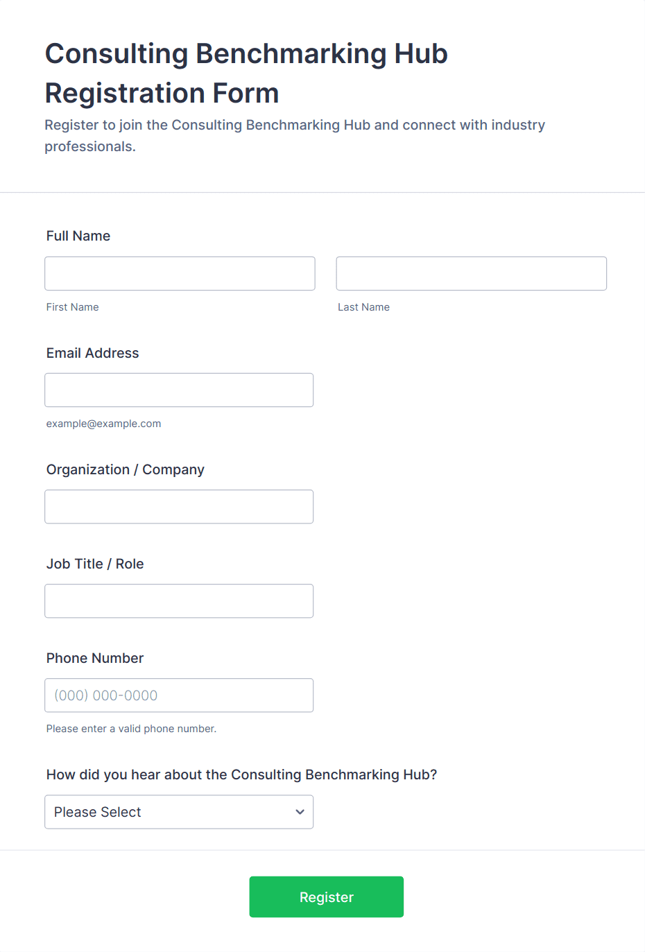 Consulting forms are specialized digital documents designed to streamline the information-gathering and communication processes between consultants and their clients. These forms can be used for a variety of purposes, such as client intake, needs assessments, project proposals, feedback collection, appointment scheduling, and progress tracking. Consulting forms help consultants efficiently collect essential details, clarify project scopes, set expectations, and document agreements, making them invaluable tools for independent consultants, consulting firms, and agencies across industries like business, IT, HR, marketing, and more.