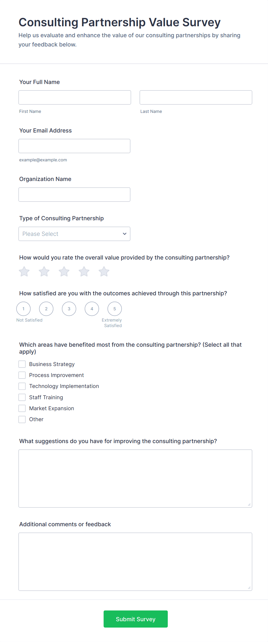 Consulting forms are specialized digital documents designed to streamline the information-gathering and communication processes between consultants and their clients. These forms can be used for a variety of purposes, such as client intake, needs assessments, project proposals, feedback collection, appointment scheduling, and progress tracking. Consulting forms help consultants efficiently collect essential details, clarify project scopes, set expectations, and document agreements, making them invaluable tools for independent consultants, consulting firms, and agencies across industries like business, IT, HR, marketing, and more.