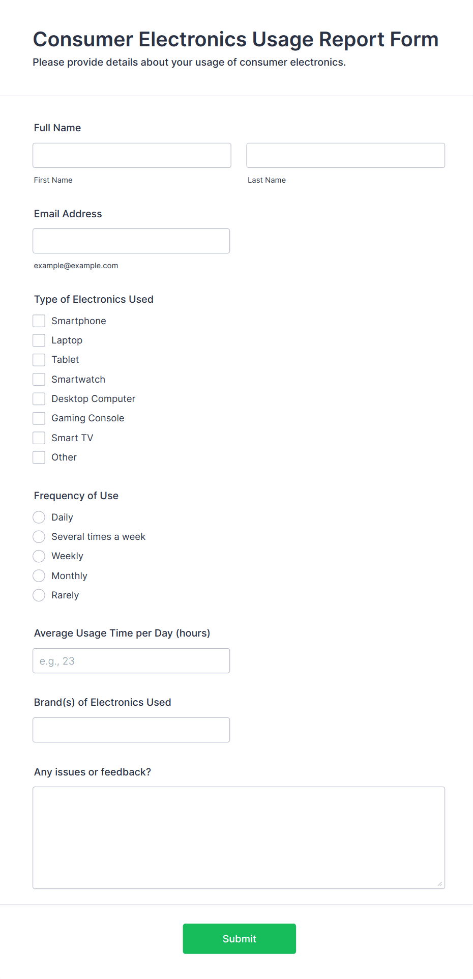 A product feedback form is a good way to gauge how well (or bad) you're doing as a company. With this product survey form sample, a variety of commonly asked questions are readily available for you to use. This product survey form will ask your respondents how long they have been using your products/services, their impression on how you compete with other competitors, their satisfaction about the products/services you offer and a couple more that's related to the overall experience they had.