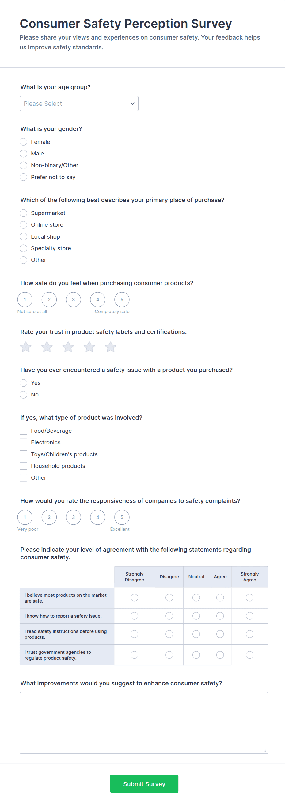Quality surveys are specialized tools designed to gather feedback, measure satisfaction, and assess the effectiveness of products, services, or processes. Organizations across industries use quality surveys to monitor customer experiences, evaluate employee performance, ensure compliance with standards, and identify areas for improvement. These surveys can be tailored for various scenarios, such as product quality assessments, service delivery evaluations, internal audits, and post-project reviews. By systematically collecting and analyzing responses, businesses and institutions can make data-driven decisions to enhance their offerings and maintain high standards.