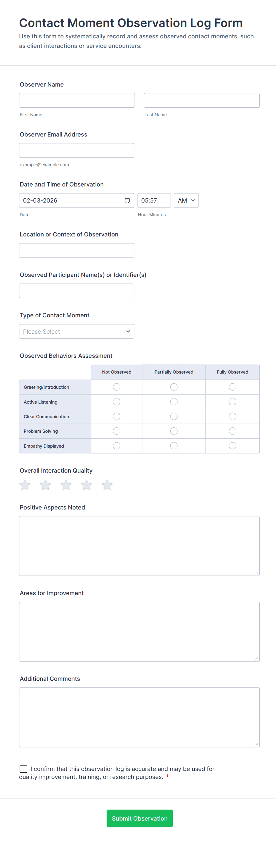 Common fields include rating scales, multiple-choice questions, open-ended comment sections, checklists, and sometimes demographic or identifying information depending on the context.