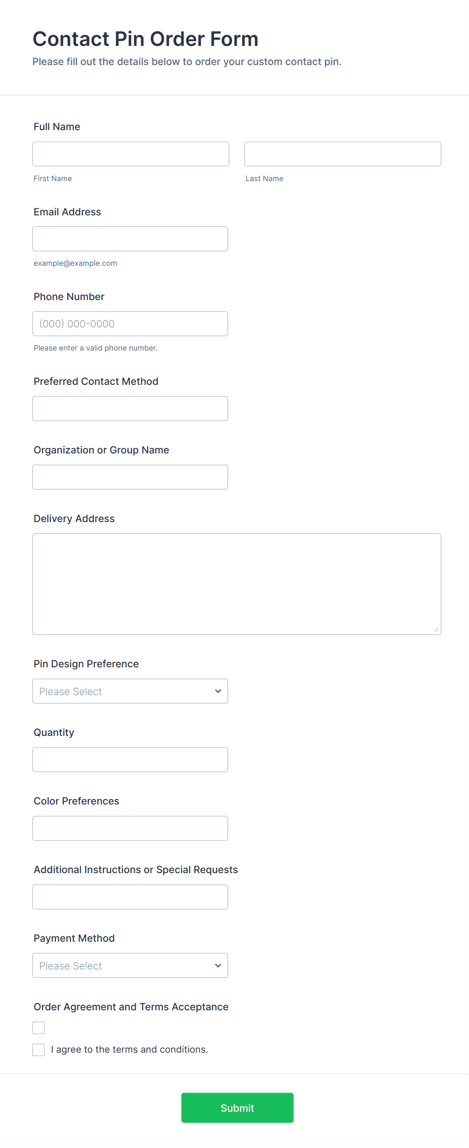 Typical fields include customer name, contact information, product selection, quantity, payment details, and shipping address (if applicable).