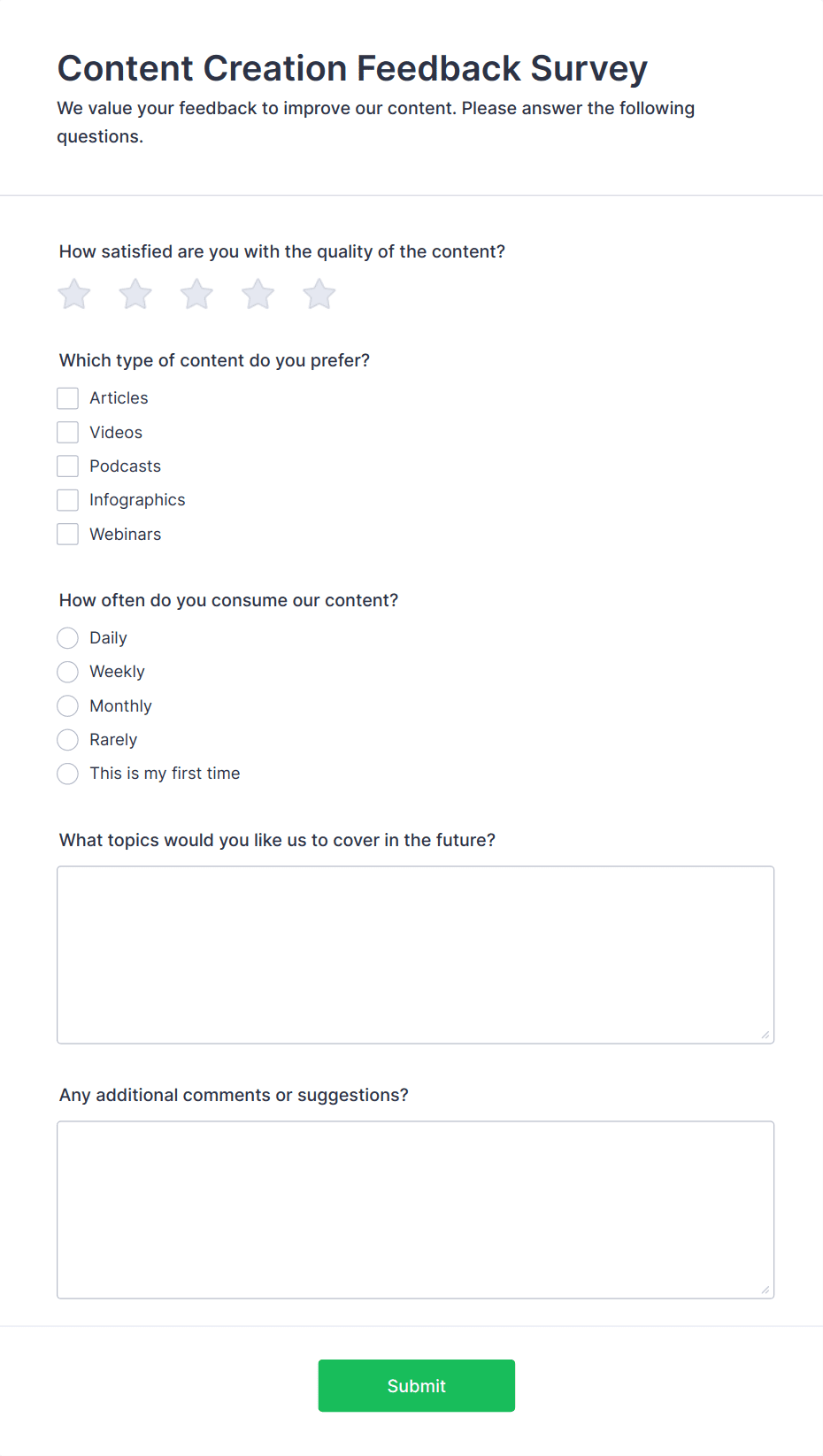 • Start by clarifying what you want to learn from your audience. Are you seeking to improve a product, assess an event, or gather employee suggestions? Your objective will guide the structure and questions of your form.