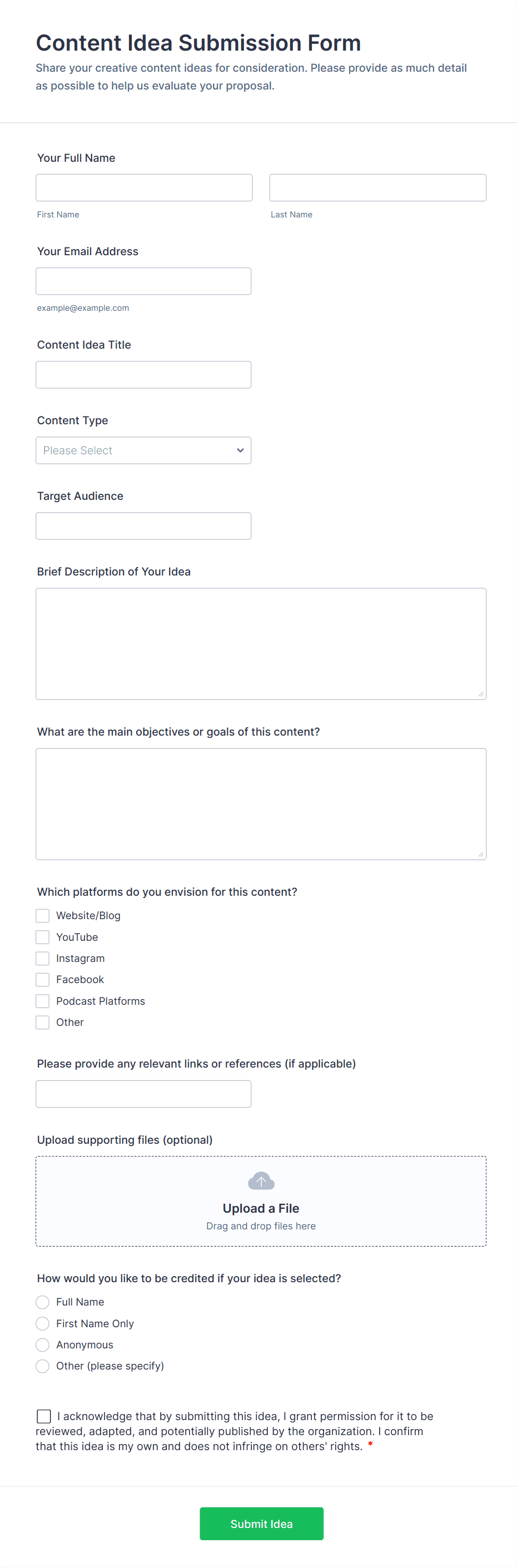 Content Forms are specialized online forms designed to facilitate the collection, submission, and management of various types of content. These forms are commonly used for gathering articles, blog posts, creative writing, multimedia files, user-generated content, feedback, and editorial submissions. Organizations, publishers, marketing teams, and educators often rely on Content Forms to streamline the process of receiving and organizing content from contributors, freelancers, or the public. Whether you’re running a magazine, managing a content marketing campaign, or collecting student assignments, Content Forms help ensure that submissions are structured, complete, and easy to review.