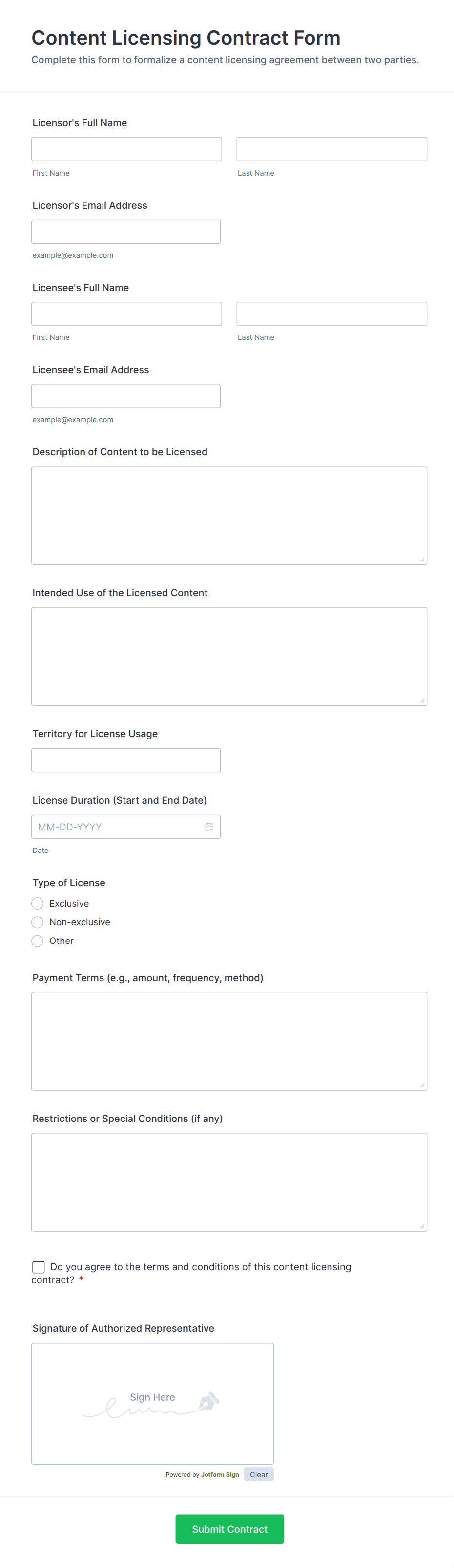The form templates here are for informational purposes only. Jotform is not providing legal, financial, or other advice, or implying that the forms are legally valid in all or any jurisdictions. Before using any such form, consult an attorney and/or other applicable professionals to make sure that the form meets your needs, legally and otherwise.
