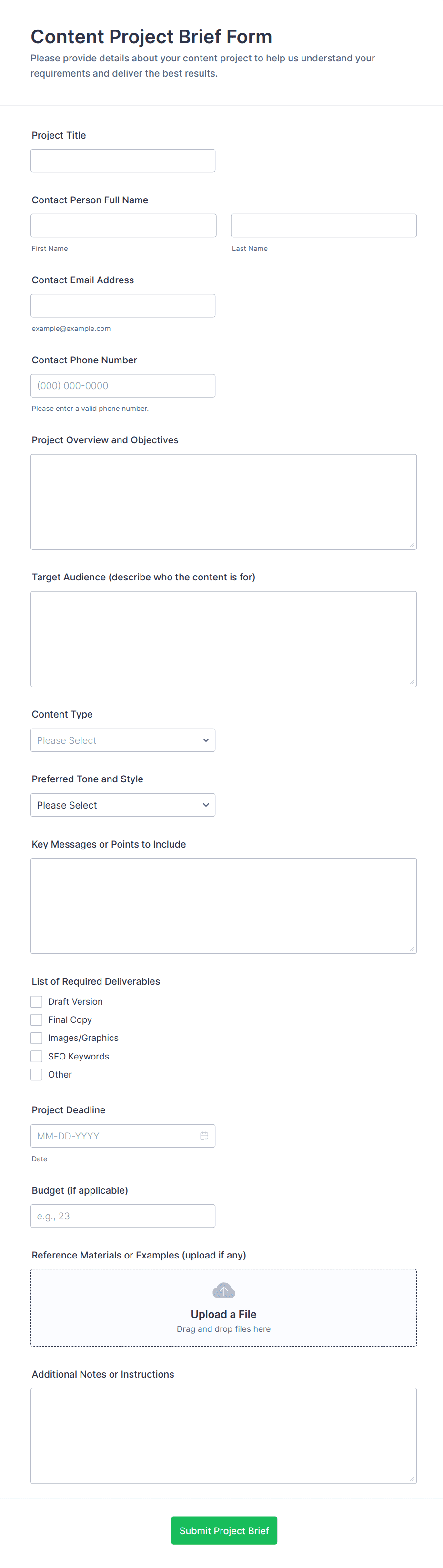Content Forms are specialized online forms designed to facilitate the collection, submission, and management of various types of content. These forms are commonly used for gathering articles, blog posts, creative writing, multimedia files, user-generated content, feedback, and editorial submissions. Organizations, publishers, marketing teams, and educators often rely on Content Forms to streamline the process of receiving and organizing content from contributors, freelancers, or the public. Whether you’re running a magazine, managing a content marketing campaign, or collecting student assignments, Content Forms help ensure that submissions are structured, complete, and easy to review.