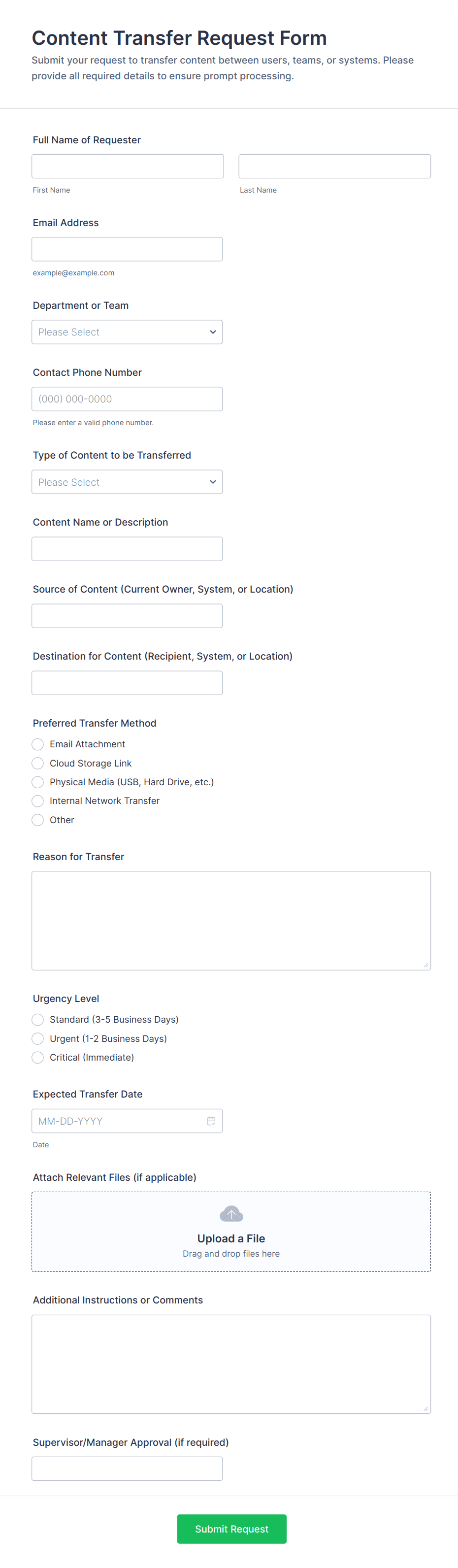 Content Forms are specialized online forms designed to facilitate the collection, submission, and management of various types of content. These forms are commonly used for gathering articles, blog posts, creative writing, multimedia files, user-generated content, feedback, and editorial submissions. Organizations, publishers, marketing teams, and educators often rely on Content Forms to streamline the process of receiving and organizing content from contributors, freelancers, or the public. Whether you’re running a magazine, managing a content marketing campaign, or collecting student assignments, Content Forms help ensure that submissions are structured, complete, and easy to review.