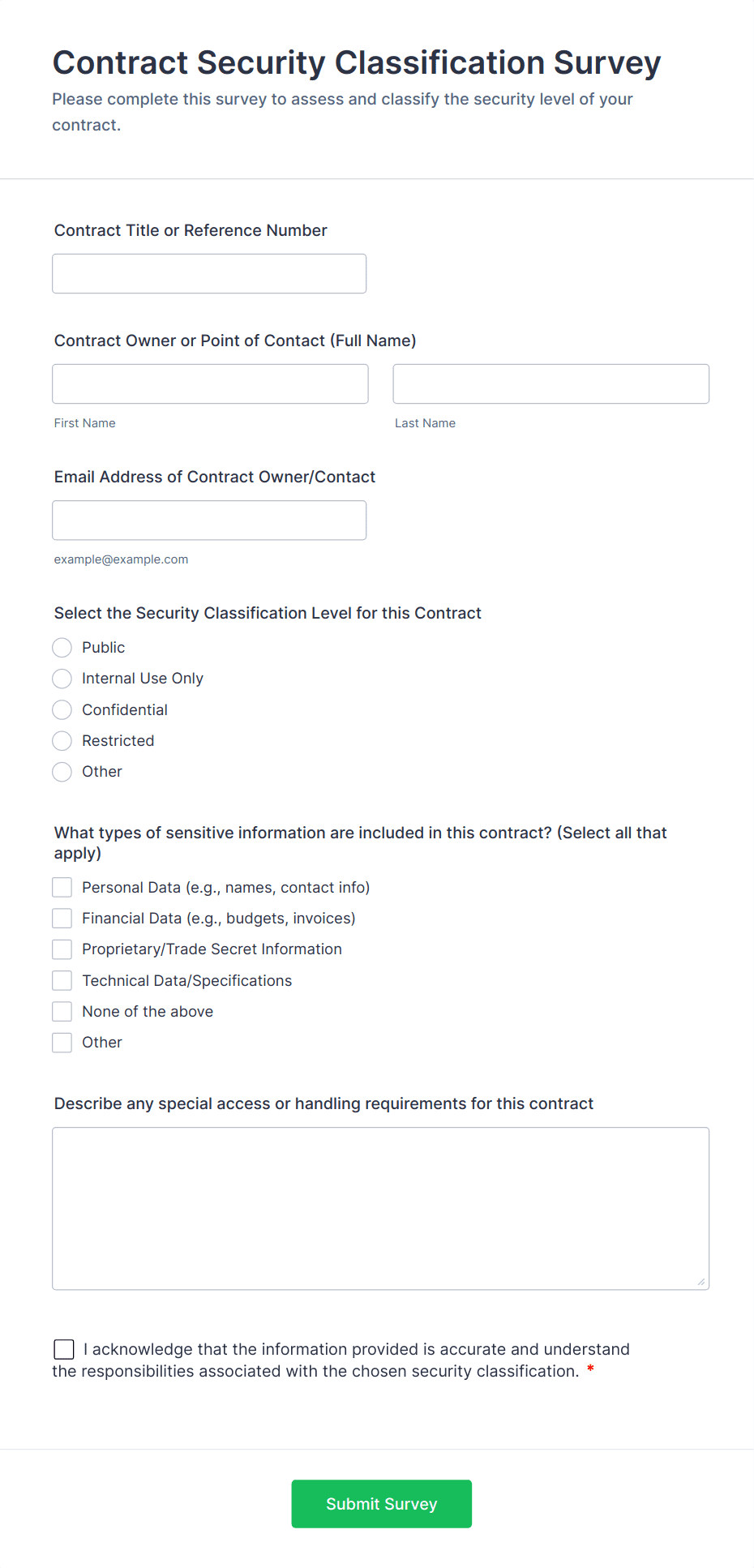- Multiple choice or checkbox fields for compliance checks.