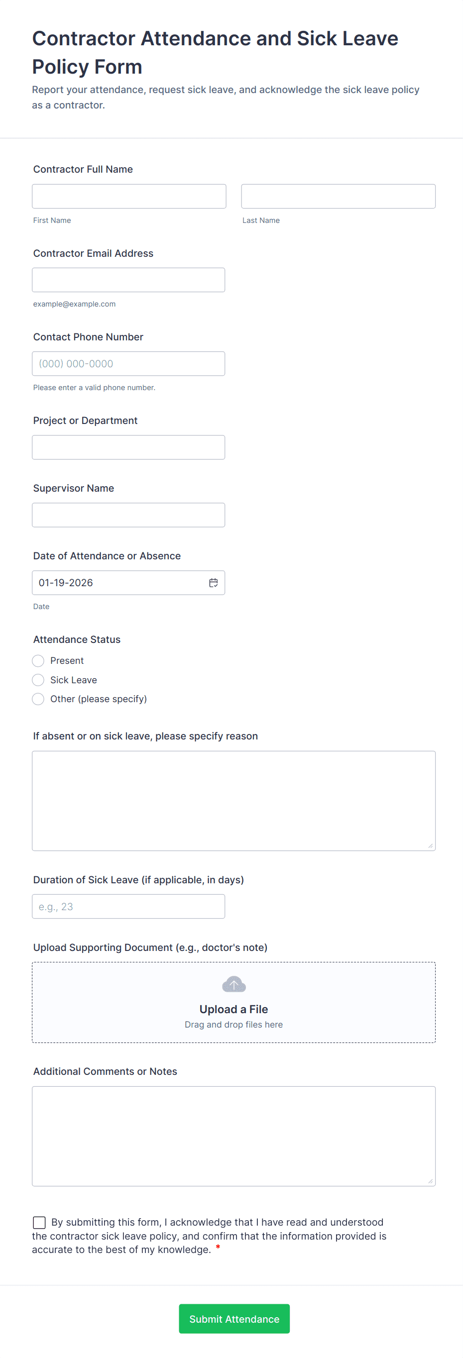 - Conditional Logic: Show or hide fields based on previous answers (e.g., request a reason if “Absent” is selected).