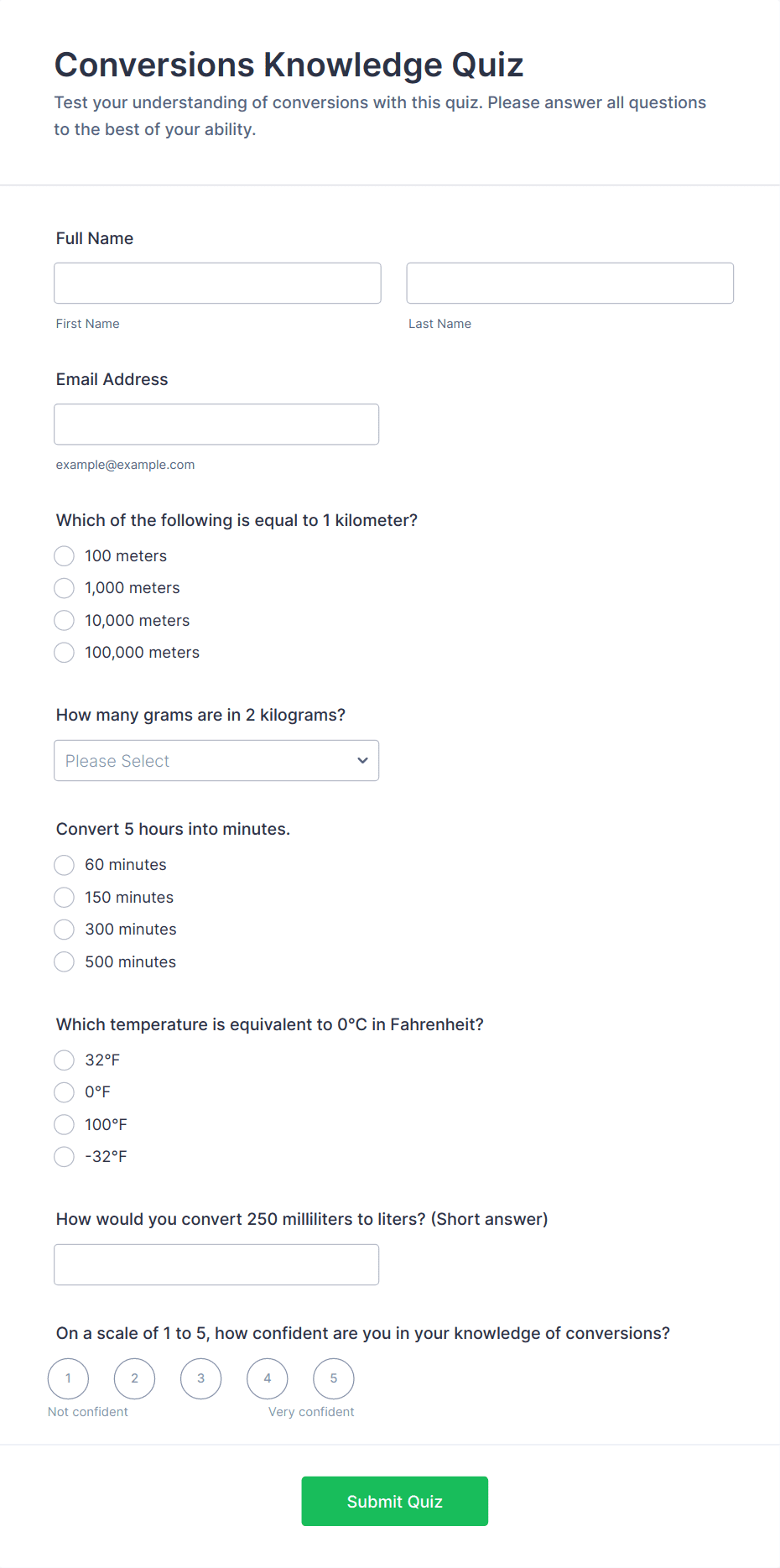 Quiz Templates are pre-designed forms specifically created to facilitate the process of building quizzes for a variety of purposes, such as education, employee training, lead generation, event engagement, and more. These templates provide a structured way to present questions, collect answers, and automatically score or evaluate responses. Whether you’re a teacher assessing student knowledge, a business running a product knowledge test, or a marketer creating a fun personality quiz, Quiz Templates offer a flexible foundation to suit your needs. They can be used for online exams, trivia games, onboarding assessments, customer feedback quizzes, and interactive learning modules.
