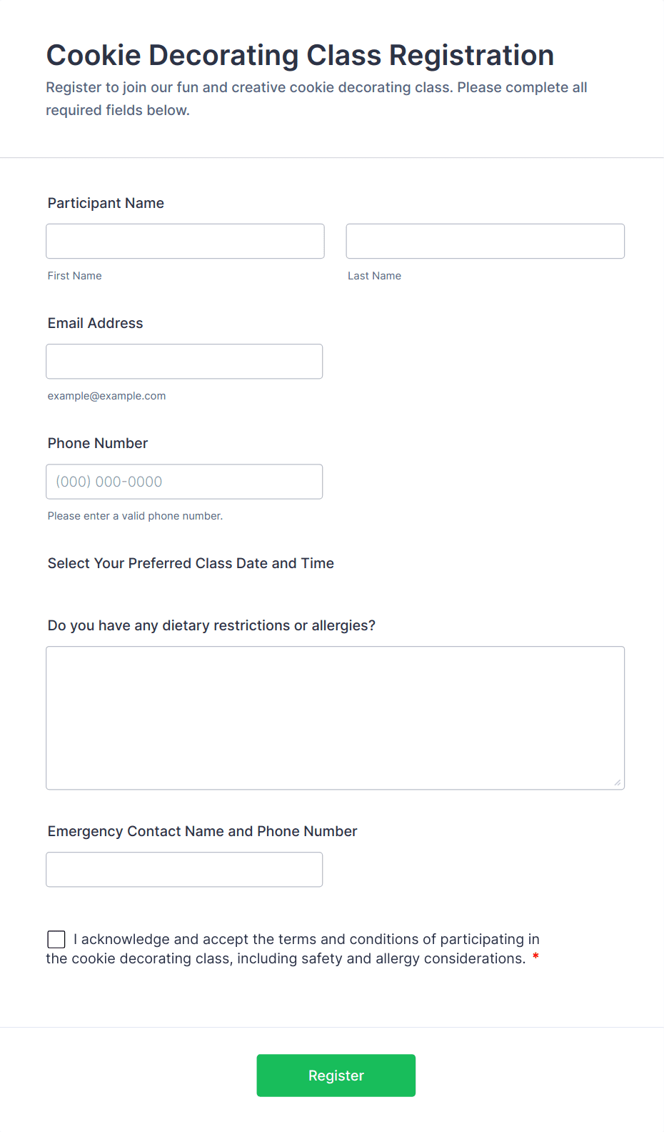 A Baking Workshop Registration Form is a form template designed to collect information from individuals who want to participate in a baking workshop or class.