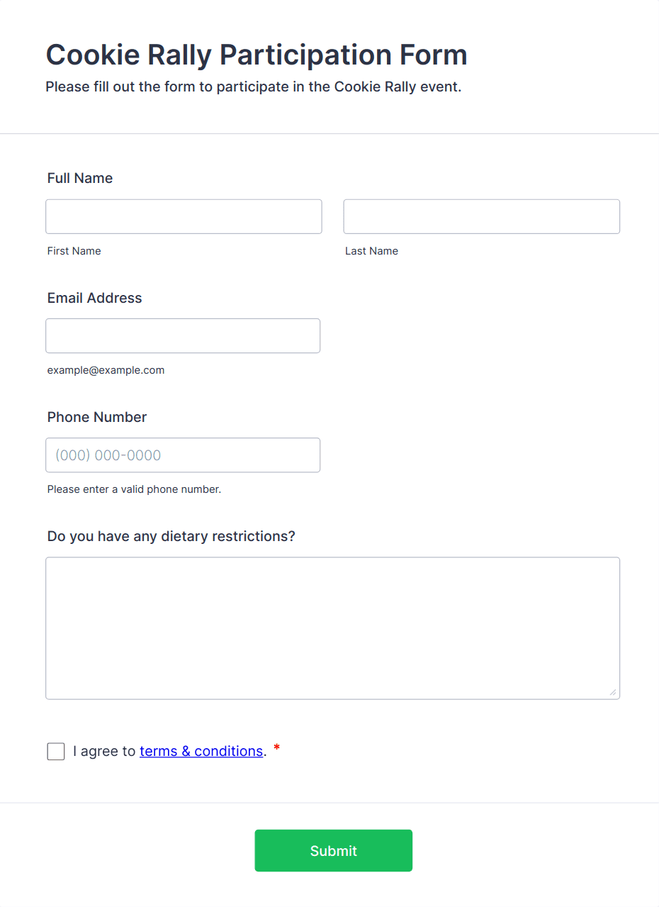 Event Registration Forms are digital tools designed to streamline the process of collecting attendee information for a wide variety of events, such as conferences, workshops, webinars, fundraisers, classes, and social gatherings. These forms allow organizers to gather essential details like participant names, contact information, payment preferences, dietary restrictions, and session selections. By using event registration forms, event planners can efficiently manage RSVPs, track attendance, and ensure a smooth check-in process on the day of the event. The flexibility of these forms makes them suitable for both small private gatherings and large-scale public events, adapting to the unique requirements of each occasion.