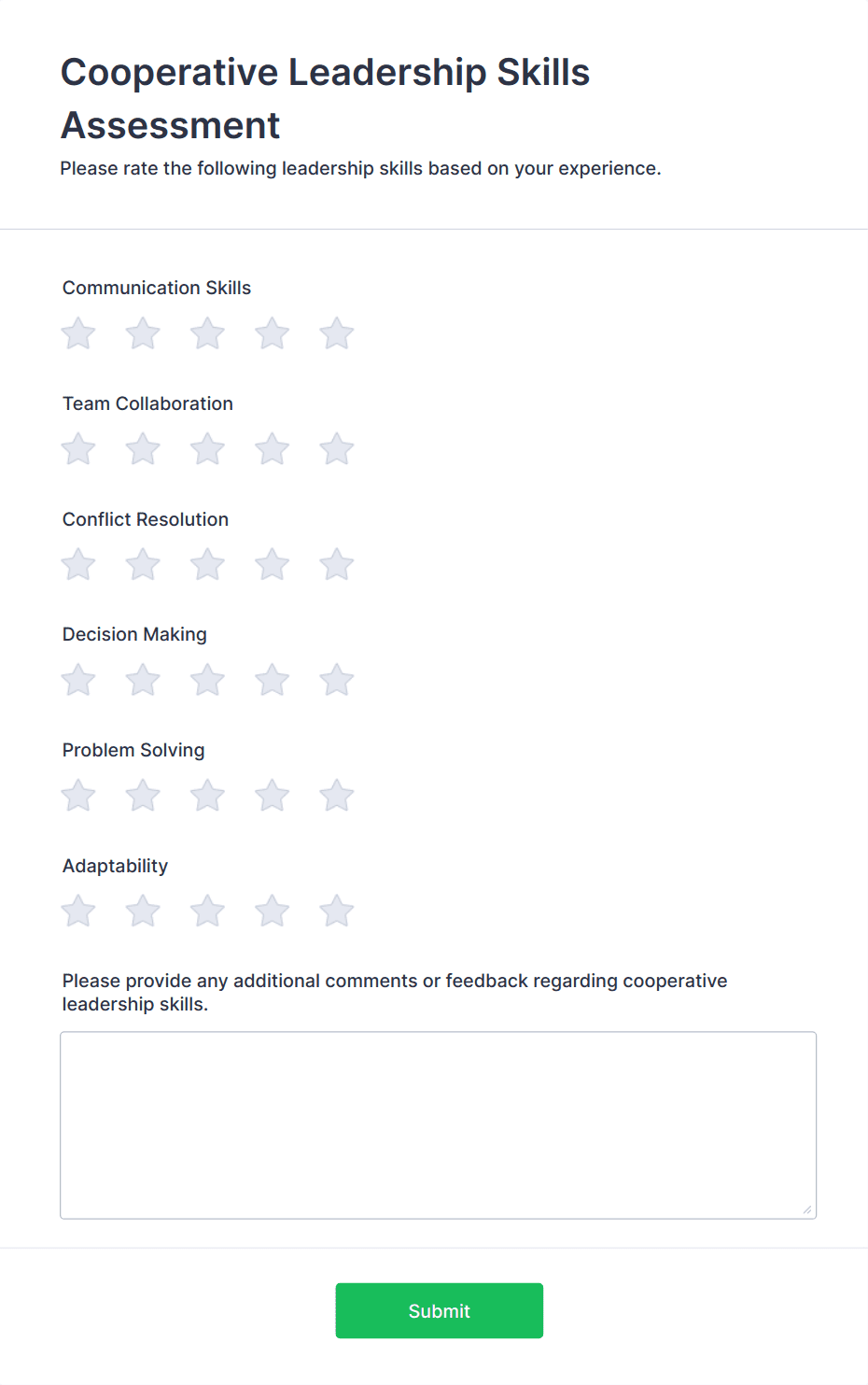 An assessment form is a questionnaire used to make assessments with all necessary metrics included. Go online with no coding!