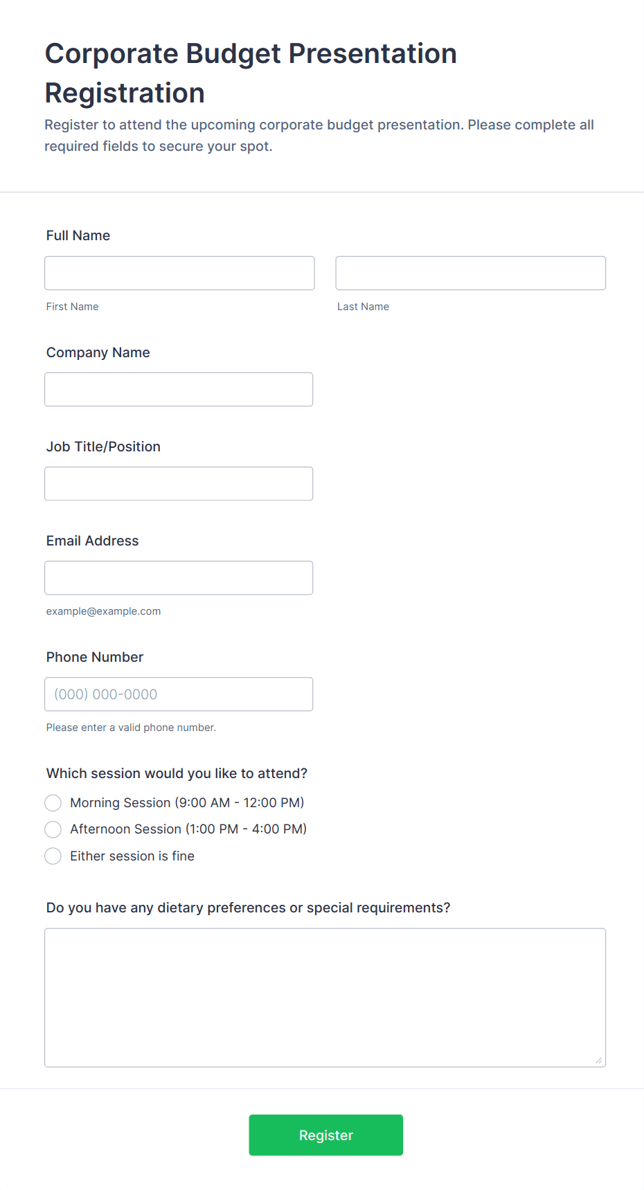 • Session or Workshop Selection (dropdowns or checkboxes)