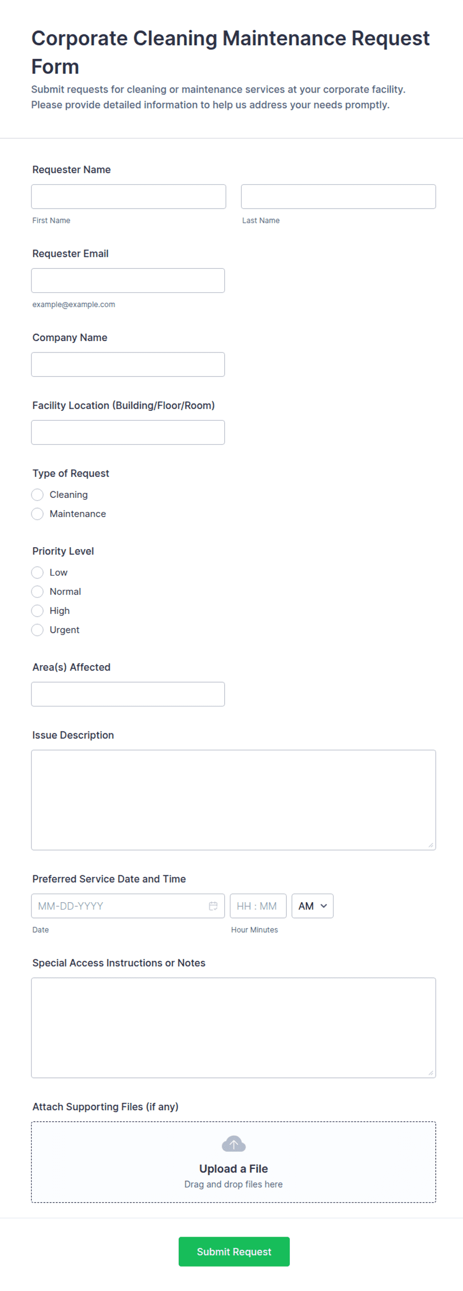A maintenance request form is used by both property owners and building managers to identify maintenance issues and submit service requests. Easy to use. No coding.