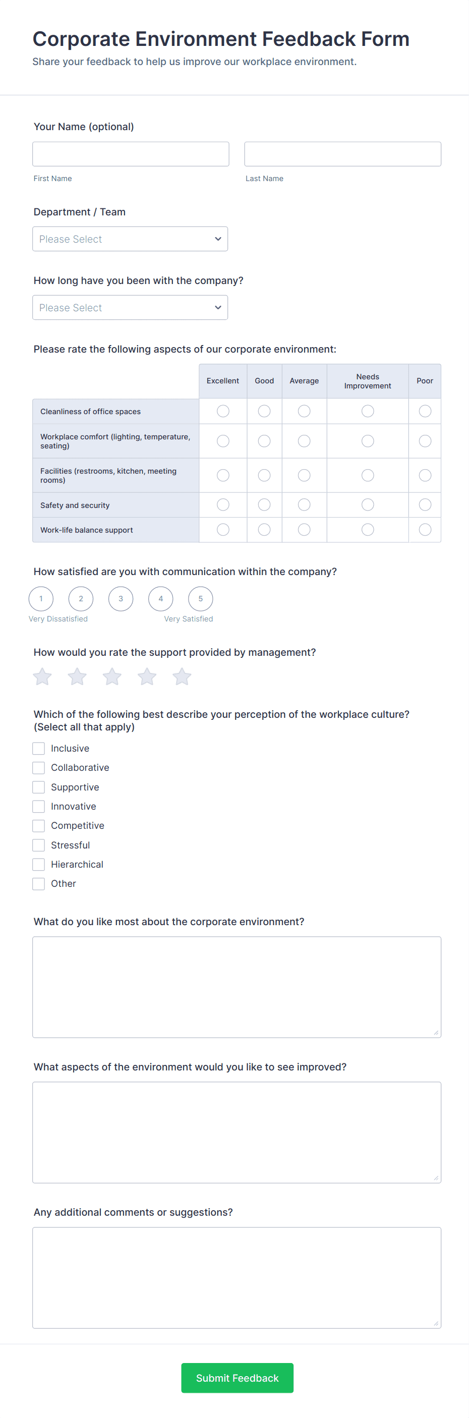Identify the current satisfaction of your employees and improve your company culture by using this Employee Feedback Form. This form template is simple and easy to understand.