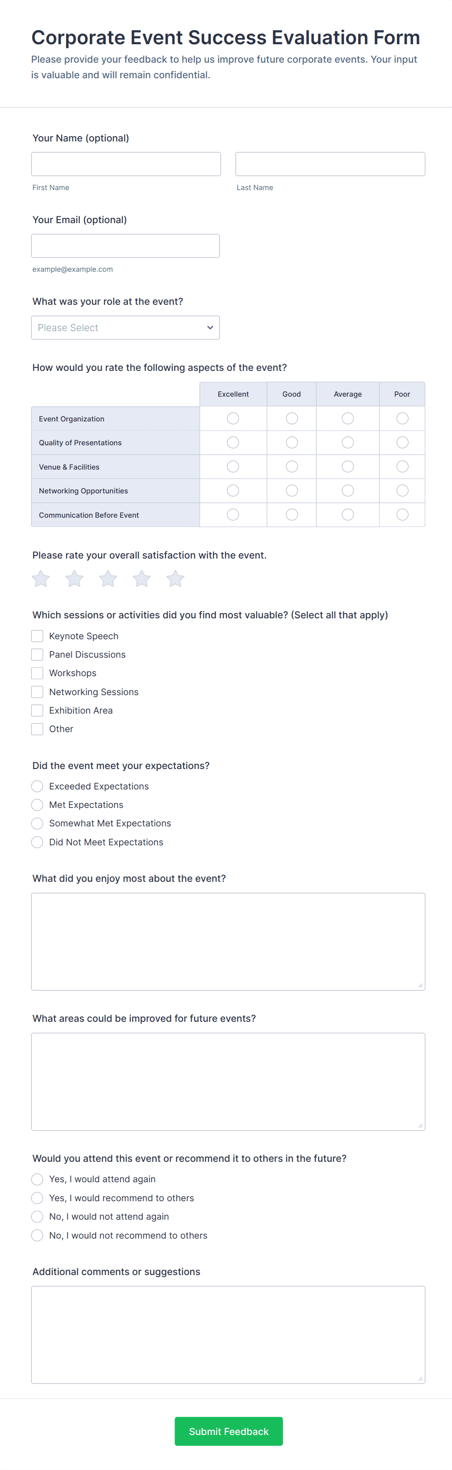 • Content and fields may vary based on event type; for example, a conference feedback form might include session ratings, while a social event form may focus on food, entertainment, and atmosphere.