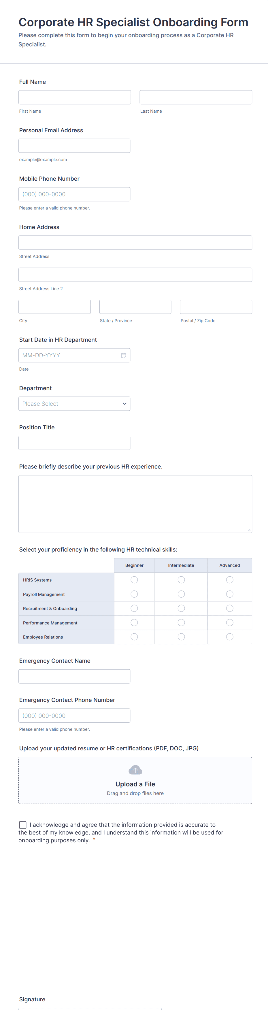- Employee onboarding: May require fields for personal details, tax forms, emergency contacts, and policy acknowledgments.