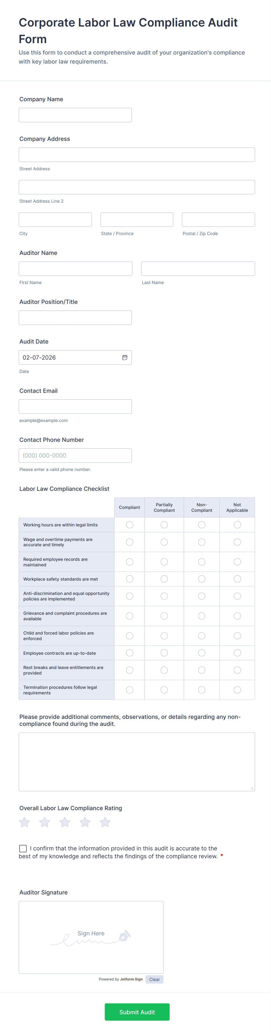 Creating an effective audit form with Jotform is straightforward and highly customizable, allowing you to address a variety of audit scenarios such as safety inspections, compliance checks, or quality control reviews. Here’s a step-by-step guide to building an audit form that fits your organization’s needs: